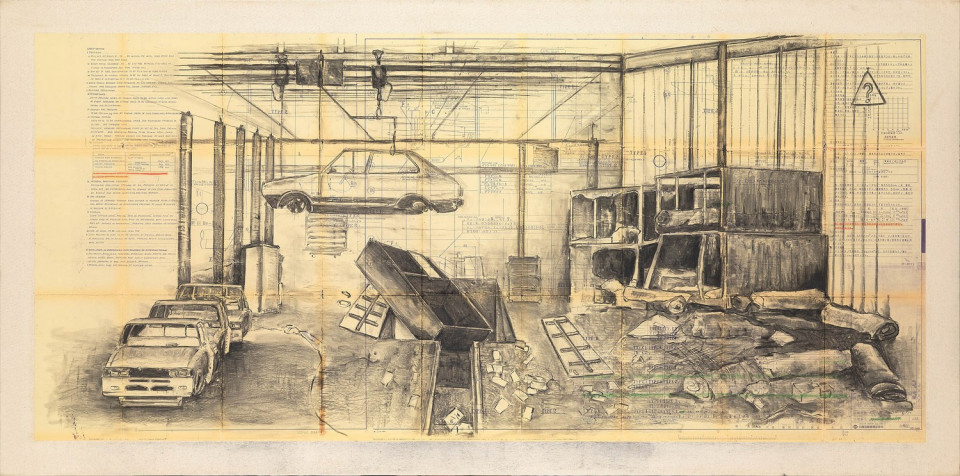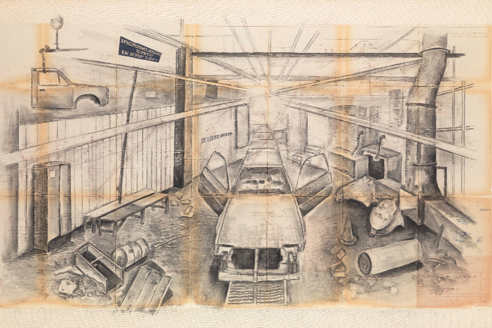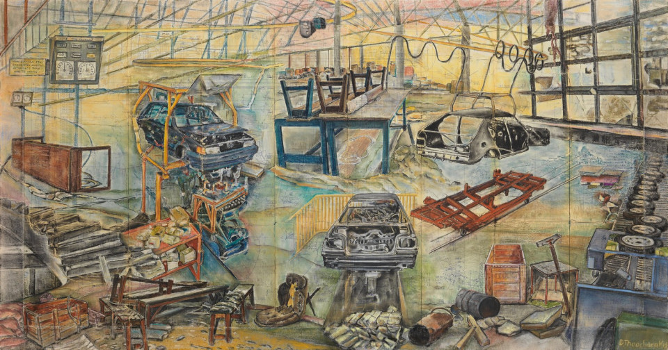 Στα πολύπλευρα και πολυεπίπεδα εικαστικά σύνολα που παρουσιάζει, καμβάδες της γίνονται τα παλιά σχέδια συναρμολόγησης (blue prints) που χρησιμοποιούνταν για την παραγωγή αυτοκινήτων στο εμβληματικό εργοστάσιο της ΤΕΟΚΑΡ ΑΒΕΕ (1980-1995), της οικογένειας Θεοχαράκη. Το εργοστάσιο αποτέλεσε μια από τις σημαντικότερες επιχειρηματικές επενδύσεις στη βιομηχανική ανάπτυξη της Ελλάδας. 29 χρόνια μετά το κλείσιμό του, έχει πια ερημωθεί.